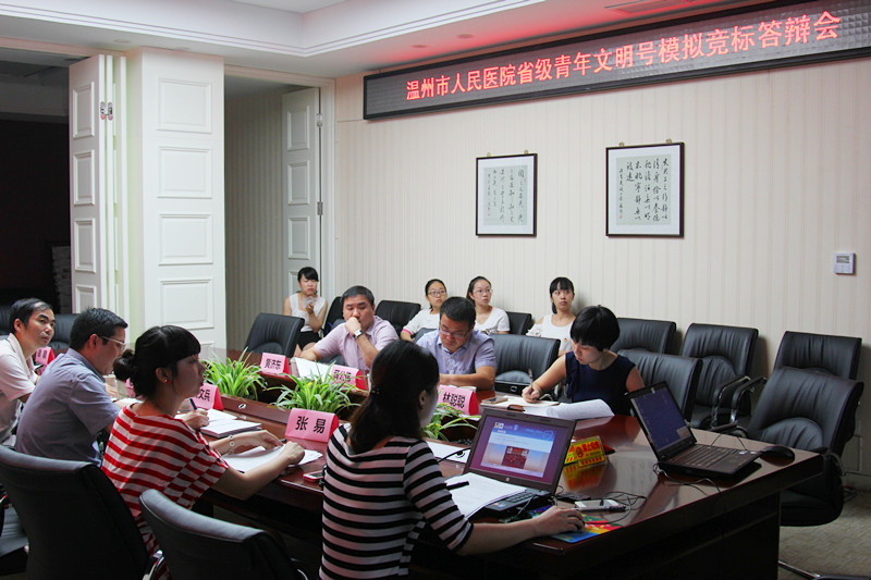 為更好的迎接省級(jí)“青年文明號(hào)”評(píng)選活動(dòng),搭建了一個(gè)公平競(jìng)爭(zhēng)的平臺(tái),并為創(chuàng)建集體提供了一個(gè)溝通交流、相互學(xué)習(xí)的機(jī)會(huì),本次競(jìng)標(biāo)答辯會(huì)邀請(qǐng)了附一醫(yī)團(tuán)委書記薛公偉、附二醫(yī)團(tuán)委副書記黃濟(jì)東及眼視光團(tuán)委副書記林聰聰擔(dān)任評(píng)委,我院院長(zhǎng)助理(前任團(tuán)委書記)姜文兵、質(zhì)管科副科長(zhǎng)(前任團(tuán)委副書記)陸千琦、團(tuán)委副書記張易、團(tuán)委委員徐穎及陳玲瓏參加競(jìng)標(biāo)答辯會(huì)。